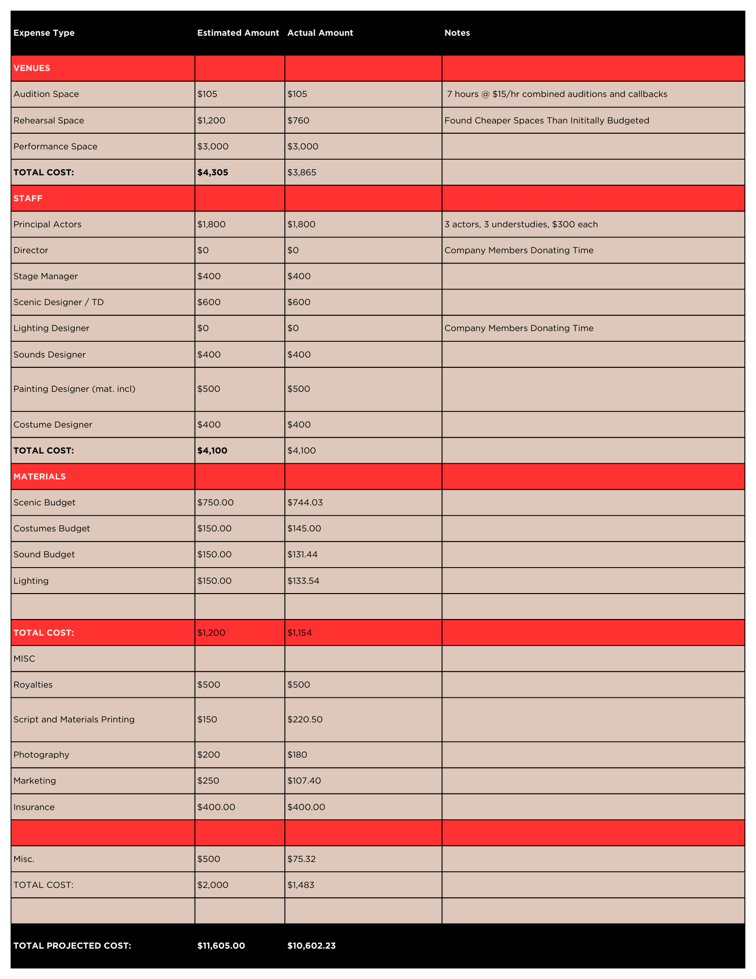 We want to put our values into practice, and for financial transparency, that means sharing the show budget with our audiences to break down what the oft-stated “making theatre is expensive!” actually means. We set our true-cost ticket prices based on the below budget, dividing the total budget ($11,605) by the total # of seats across all performances (40 seats x 11 performances = 440): 11,605/440 = 26.375, rounded up for ease of sale.
